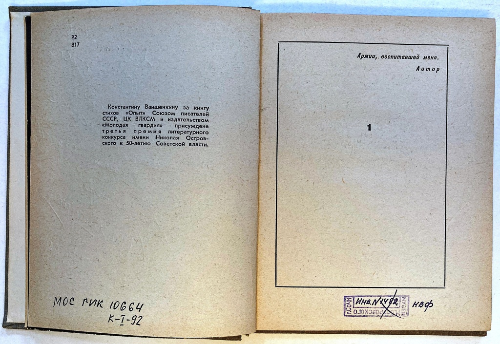 Ваншенкин К. Опыт. Лирика. М.: Издательство ЦК ВЛКСМ «Молодая гвардия», 1968.