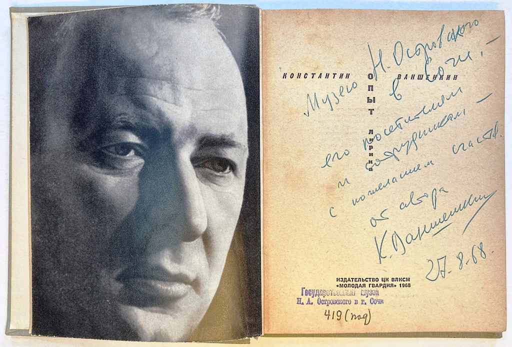 С автографом автора: «Музею Н. Островского в Сочи — его посетителям и сотрудникам — с пожеланием счастья от автора. К. Ваншенкин. 27.8.68.».