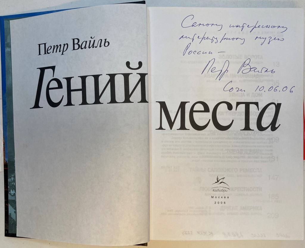 С автографом автора: «Самому интересному музею России. Пётр Вайль. Сочи. 10 июня 2006 года».Дарственная надпись была сделана в музее Н. Островского во время встречи писателя с участниками молодежного литературного объединения «Русская речь» и почитателями русской словесности города Сочи.