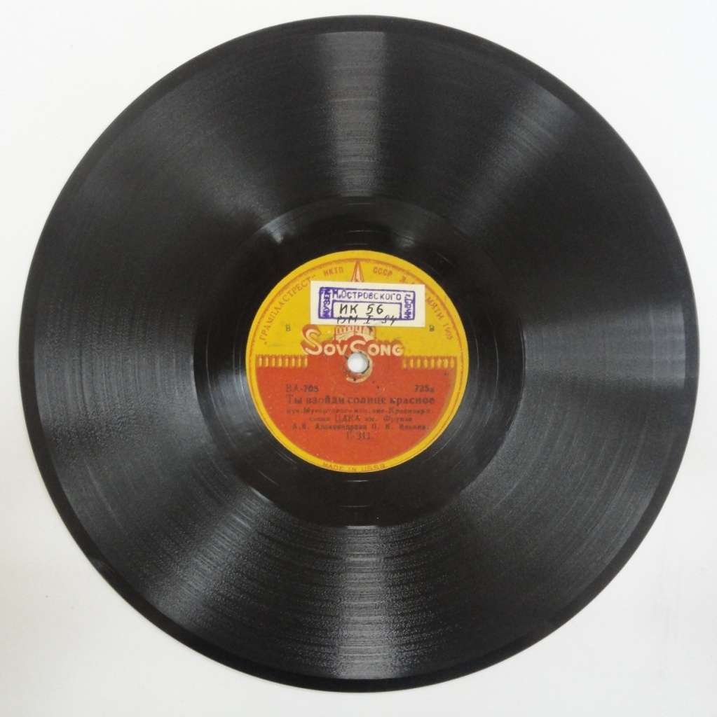 На второй стороне — песня «Ты взойди, солнце красное», музыка М.П. Мусоргского; исполняет ансамбль «Красноармейская песня» ЦДКА им. Фрунзе А.В. Александрова и П.И. Ильина.Пластинка подарена писателю в Сочи 24 ноября 1935 года Григорием Ивановичем Петровским, Председателем ЦИК СССР.