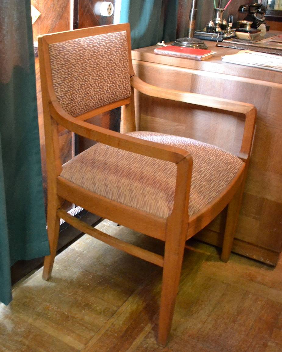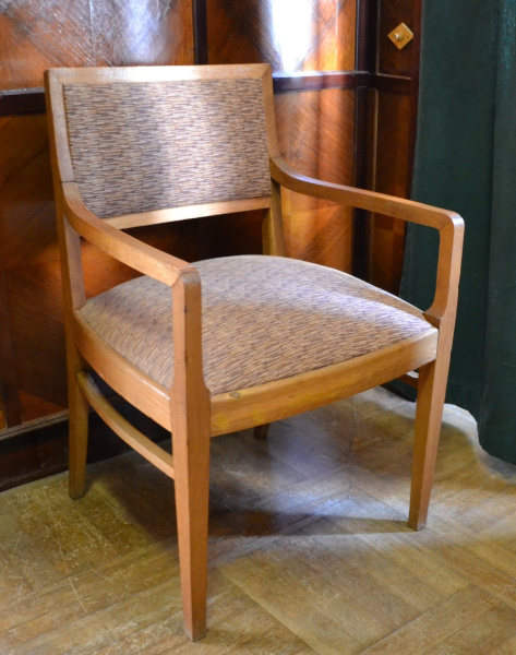 Кресло дубовое с мягкой обивкой из мебельного репса. В состав мебельного гарнитура, изготовленного для кабинета писателя на Дагомысской мебельной фабрике Сочи по заказу городских властей, вошли два таких кресла.