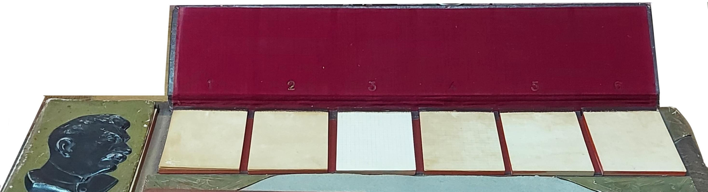 Вверху, под откидной крышкой с надписью «Шестидневка» — шесть блокнотов (бумага в клетку), над каждым из них, на откидной крышке, выдавлены цифры от «1» до «6».