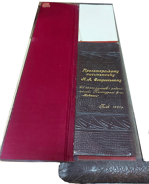 Бювар подарен Н. Островскому делегацией комсомола Украины 25 ноября 1935 года.