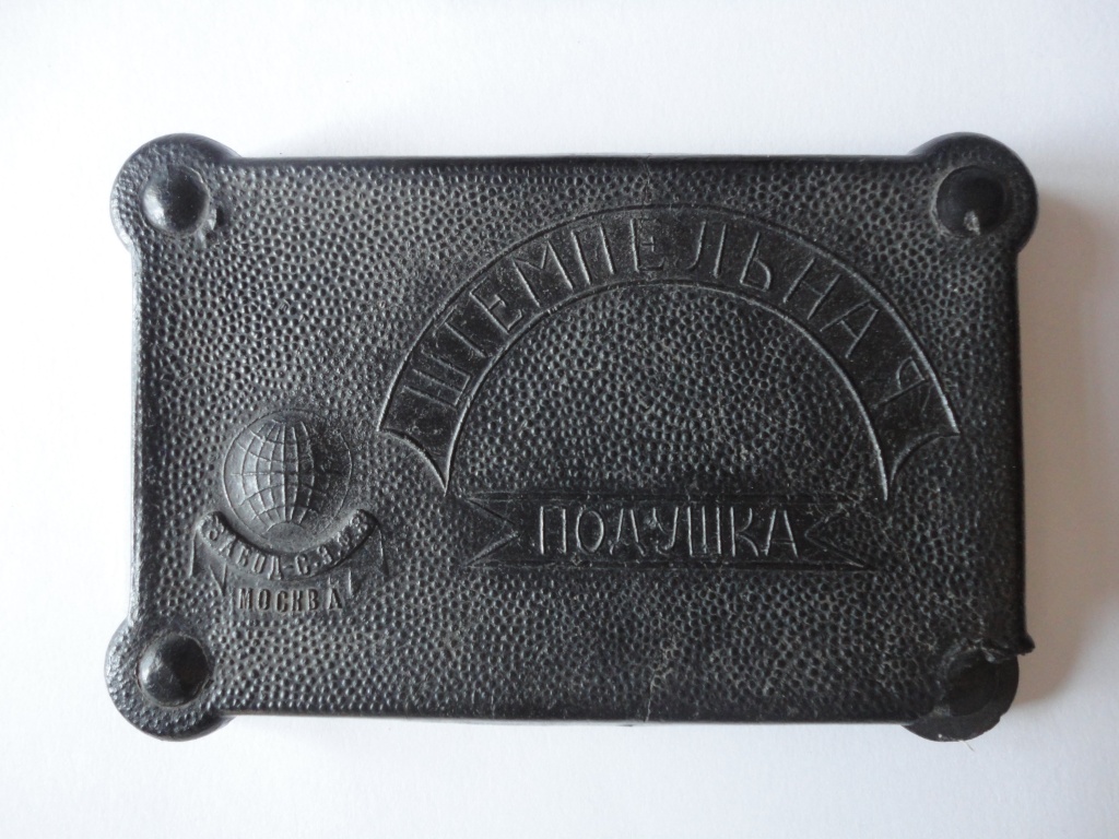 Штемпельная подушка представляет из себя футляр из черной пластмассы размером 13х8,5 см. Куплена была в 1936 году. Крышка фигурная, на ней надпись «Штемпельная подушка», вытеснен глобус и под ним надпись «Завод СЗУЗ. Москва».