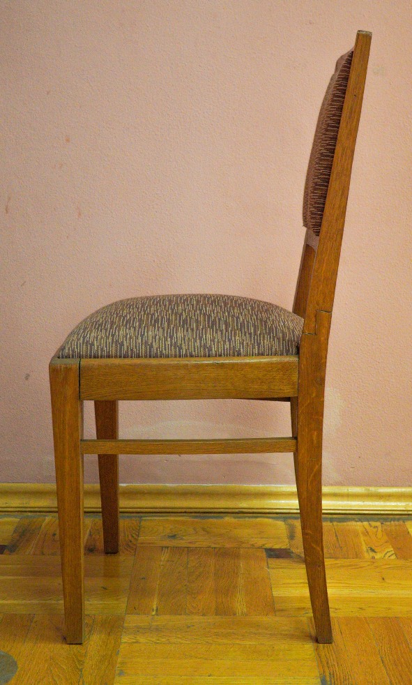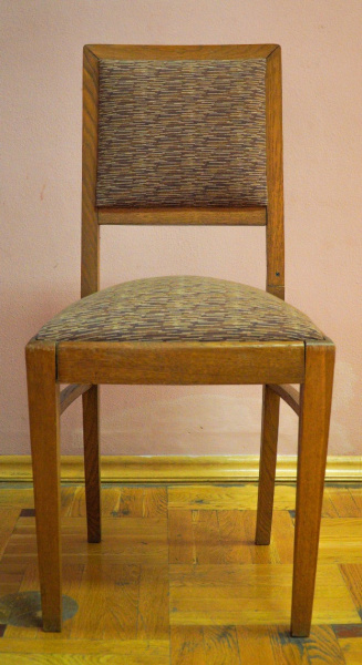 Стул дубовый с мягкой обивкой из мебельного репса. В состав мебельного гарнитура, изготовленного для кабинета писателя на Дагомысской мебельной фабрике Сочи по заказу городских властей, вошли шесть таких стульев.