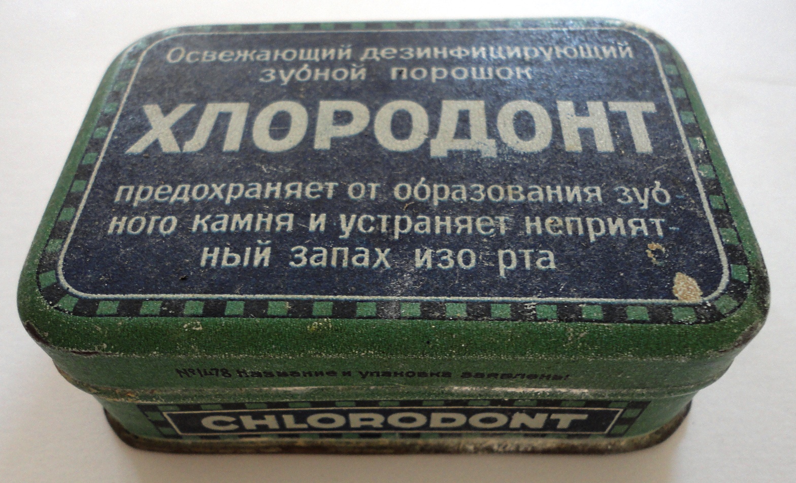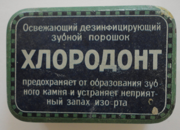 На крышке надпись: «Освежающий дезинфицирующий зубной порошок Хлородонт предохранят от образования зубного камня и устраняет неприятный запах изо рта».