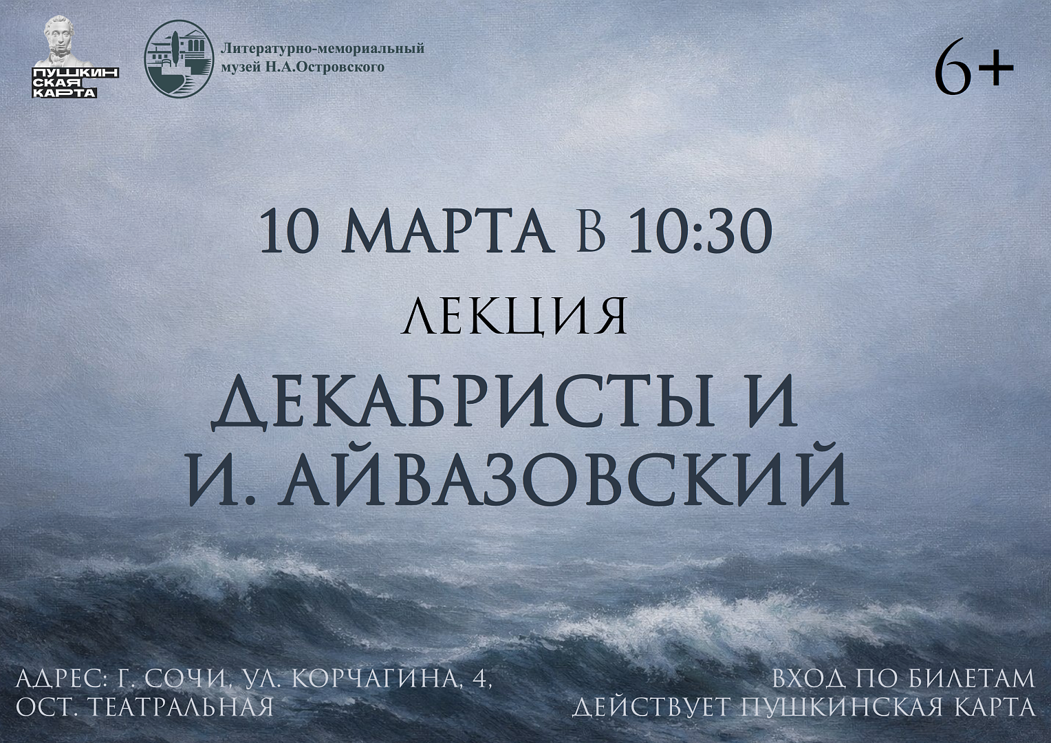10 марта в Музее Н. Островского состоится лекция «Декабристы и И. Айвазовский». Это уникальная возможность увидеть историю России под неожиданным углом. Казалось бы, что связывает великого художника-мариниста и сосланных на Кавказ декабристов? Оказывается, их пути пересеклись самым драматичным образом!